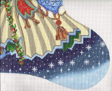The painted canvas design area is 13" by 23", with plenty of room to Personalize the Stocking and plenty of additional surrounding background canvas surrounding the design. This is an exquisite canvas and sure to become a treasured family heirloom. The blue background is a nice balance, and the toe and cuff areas at bedecked with stars and snowflakes.