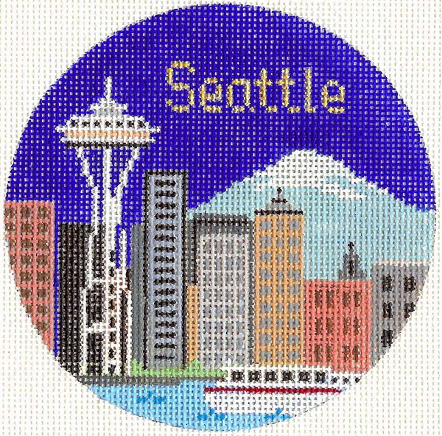 Travel Round ~ Seattle, Washington (Space Needle) 18 Mesh handpainted 4.25" Needlepoint Canvas by Silver Needle