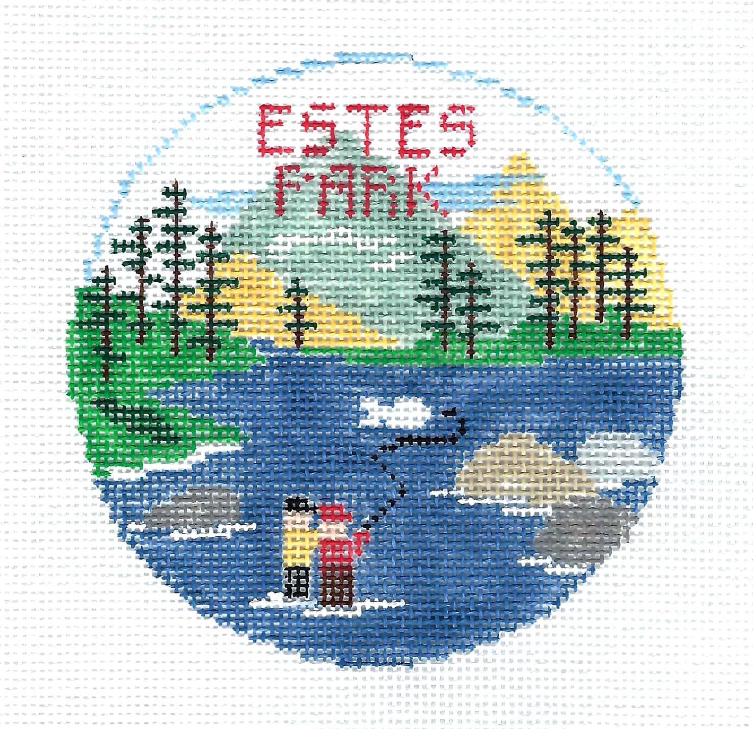 Travel Round ~ Estes Park, Colorado 4" Rd. 18 mesh handpainted Needlepoint Canvas Ornament by Kathy Schenkel