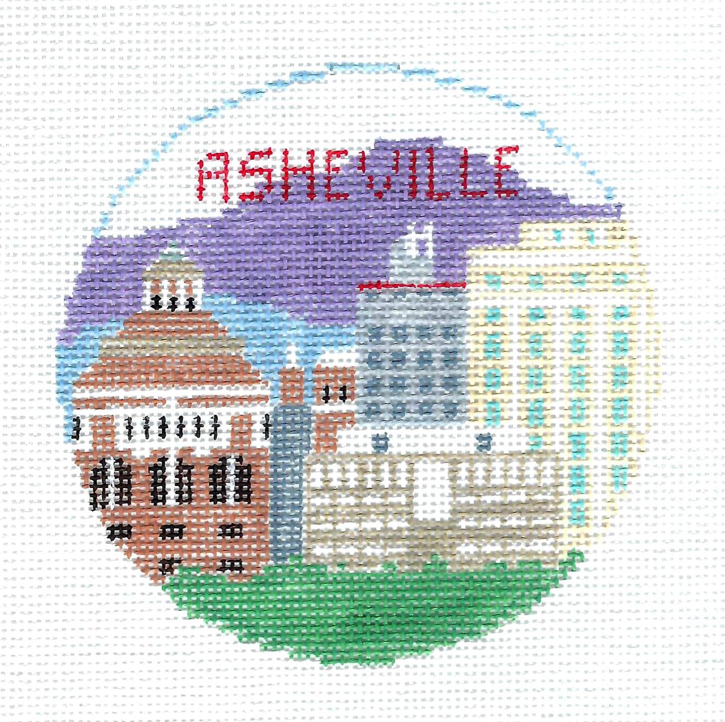 Travel Round ~ ASHEVILLE, NORTH CAROLINA 18 Mesh 4" Round handpainted Needlepoint Canvas by Kathy Schenkel