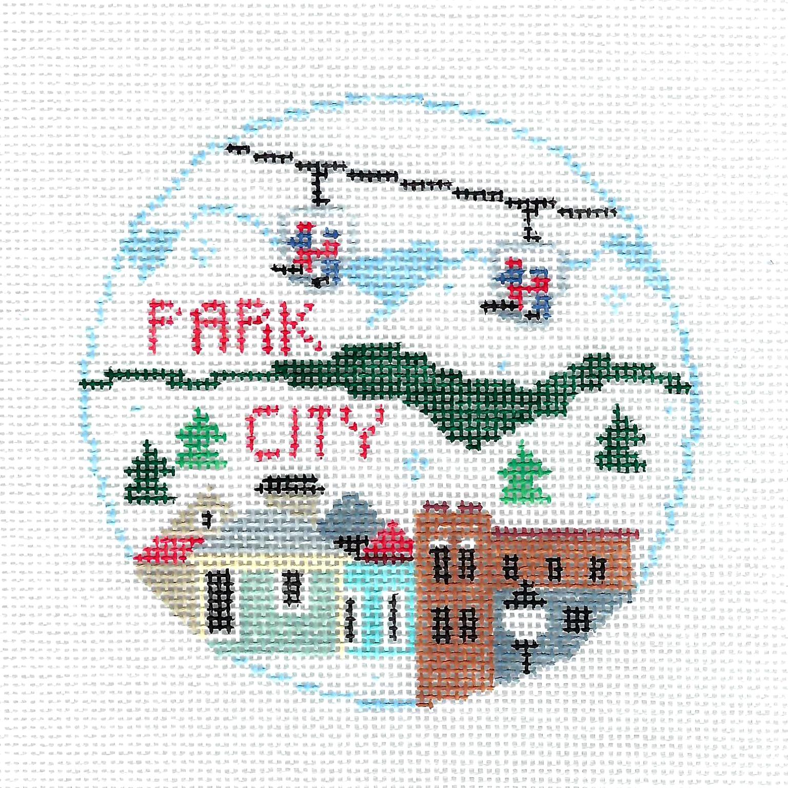 Travel Round ~ Park City, Utah handpainted 4" Round 18 Mesh Needlepoint Canvas by Kathy Schenkel