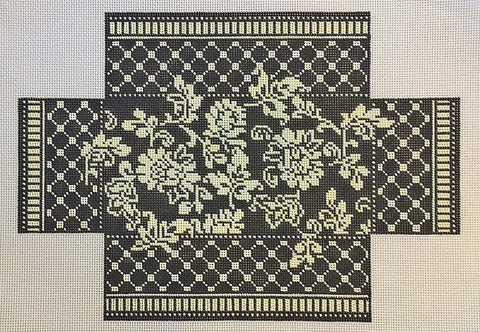 This beautiful Damask patterned brick cover is hand painted on 13 mesh mono. The total painted area is approximately 14" by 9.75" on an approximate 18.5" by 14.5" background.