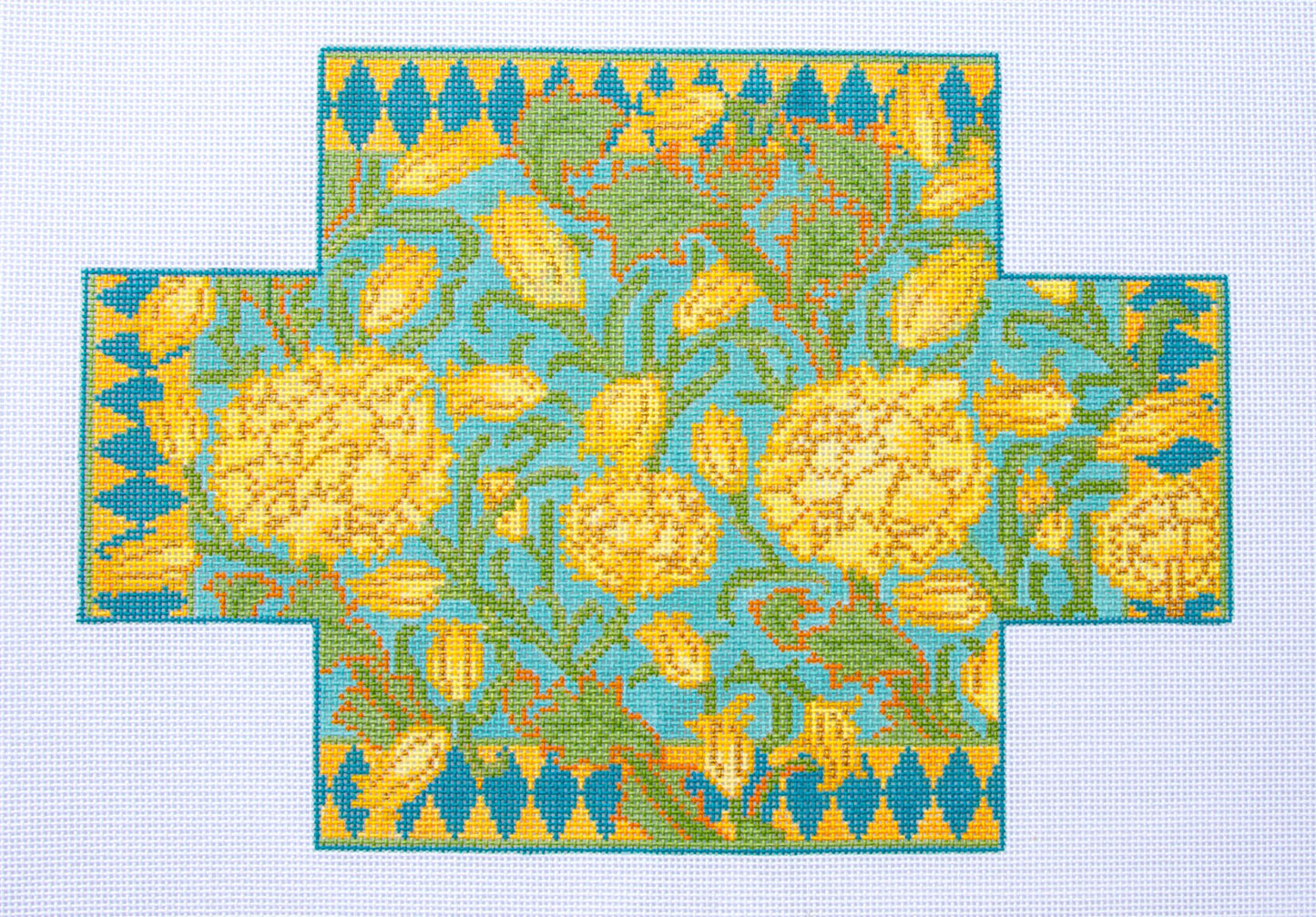 This elegant William's Wild Tulips brick cover features beautifully hand painted design in shades of Blue, Yellow and Metallic Gold colors, on 13 mesh mono canvas.