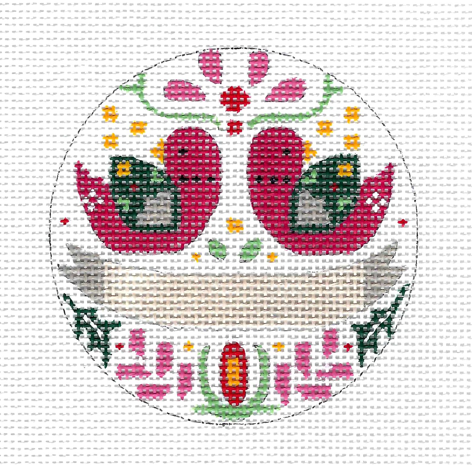 The Design is hand painted on 13 mesh mono canvas hand painted design is 4" round ornament.